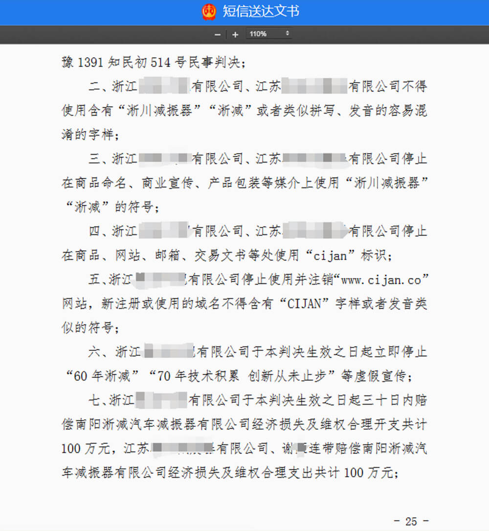 此次勝訴簡(jiǎn)單理解就是以后任何非淅減公司采用“淅減、CIJAN、淅川減振器”或與CIJAN發(fā)音類似的名稱均是違法行為,屬于假冒侵權(quán),淅減有權(quán)要求其改名或通過(guò)法律途徑維護(hù)相關(guān)權(quán)利。
